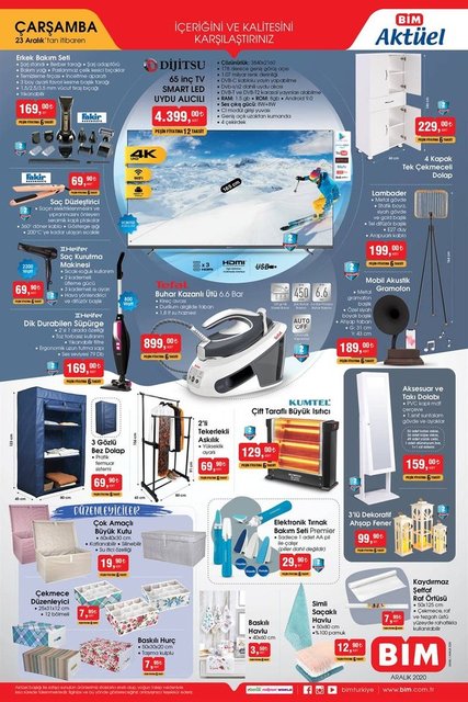 BİM 23 Aralık 2020 Aktüel ürünler kataloğu satışa çıktı. BİM'de bu hafta ; Dijitsu 65″ Smart Led TV, Dik Durabilen Süpürge, Fakir Saç Düzleştirici, Aksesuar ve Takı Dolabı, temizlik ürünleri ve gıda ürünlerinde birçok indirimli fiyat yer alıyor. İşte, 23 Aralık BİM indirimli ürünler listesi...