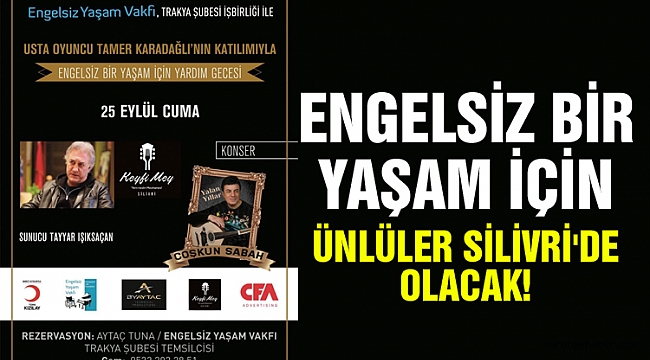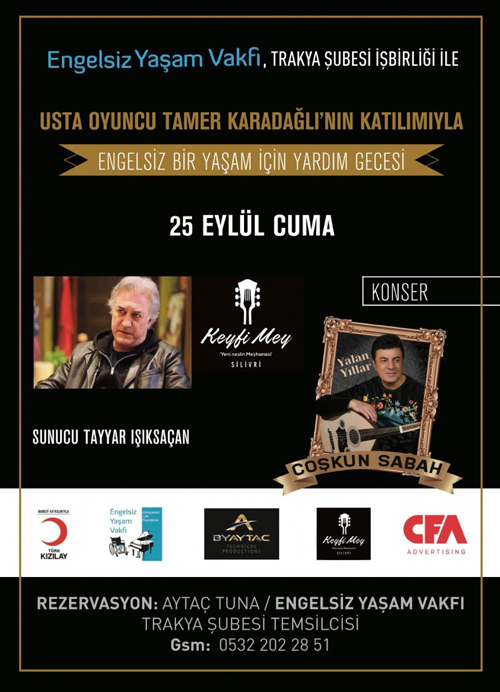 Oyuncu Tamer Karadağlı'nın katılacağı ve Sanatçı Coşkun Sabah'ın sahne alacağı engelsiz yaşam vakfı Trakya Şubesi işbirliğiyle organize edilen gece 25 Eylül Cuma günü Silivri'de yapılacak.Sağlık ve hijyen tedbirlerinin alınacağı ve sosyal mesafenin korunacağı özel program Soyaslan KEYFİ MEY'de düzenlenecek. Vakıf Kurucu Genel Başkanı Atilla Kaplakarslan ve Vakıf Trakya Şubesi Temsilcisi Aytaç Tuna'nın evsahipliğinde gerçekleştirilecek geceye katılım ve vakıf çalışmalarına destek için aytaç tuna ile 0532 202 28 51, Caner Budak ile 0535 744 90 28 nolu telefonlardan irtibata geçebilirsiniz.
