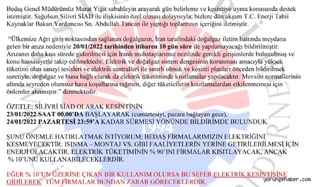 Konuya yönelik Kocabaş'ın üyelerine duyurusu şöyle: “BEDAŞ Genel Müdürümüz Murat Yiğit arayarak gün belirleme ve kesintiye uyma konusunda destek istemiştir. Sağolsun Silivri SİAD ile ilişkisinin özel olması dolayısıyla; bizlere dün akşam T.C. Enerji Tabii Kaynaklar Bakan Yardımcısı Abdullah Tancan ile yaptığı toplantının içeriğini iletmiştir. “Ülkemize Ağrı giriş noktasından sağlanan doğalgazın, İran tarafındaki doğalgaz iletim hattında meydana gelen bir arıza nedeniyle 20/01/2022 tarihinden itibaren 10 gün süre ile yapılamayacağı bildirilmiştir.Arızanın daha kısa sürede giderilmesi için İranlı muhataplarımız nezdinde gerekli girişimlerde bulunulmuş ve konu hassasiyetle takip edilmektedir. Elektrik ve doğalgaz sistem dengesinin korunması amacıyla yüksek tüketimi olan sanayi tesisleri ve elektrik santralleri ile sınırlı olmak ve kesinti planları önceden bildirilmek suretiyle, doğalgaz ve buna bağlı olarak da elektrik tüketiminde kısıtlamalar yapılacaktır. Mevsim normallerinin altında seyreden olumsuz hava koşullarına rağmen, diğer tüketicilerin kısıtlamalardan etkilenmemesi için önlemler alınmıştır.” denmektedir.SİLİVRİ'DE ENERJİ KISITLAMASI NE ZAMAN UYGULANACAK?Özetle; Silivri SİAD olarak kesintinin 23/01/2022 saat 00.00'da başlayarak (Cumartesiyi, Pazara bağlayan gece), 24/01/2022 Pazartesi 23:59'A kadar sürmesi yönünde bildirimde bulunduk.“KISITLAMAYA UYGULMAZ İSE KESİNTİYE GİDİLECEK OLUP TÜM FİRMALAR ZARAR GÖRECEK”Şunu önemle hatırlatmak istiyorum; BEDAŞ firmalarımızın elektriğini kesmeyecektir. Isınma – montaj vs. gibi faaliyetlerin yerine getirilebilmesi için enerji olacaktır. Elektrik tüketiminin % 90'ını firmalar kısıtlayacak, ancak % 10'unu kullanabileceklerdir. Eğer % 10'un üzerine çıkan bir kullanım olursa bu sefer elektrik kesintisine gidilerek tüm firmalar bundan zarar göreceklerdir.KISITLAMAYA HASSASİYET ÇAĞRISIKonuyla alakalı olarak vardiya sisteminizi gözden geçirmenizi ve kısıtlamaya hassasiyet ile uymanızı istirham ediyorum. Bu vesileyle tüm üyelerimize ve bölge sanayicilerimize saygılar sunarım.”