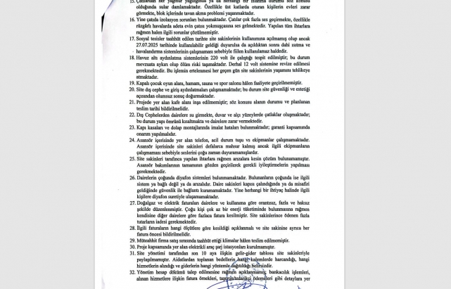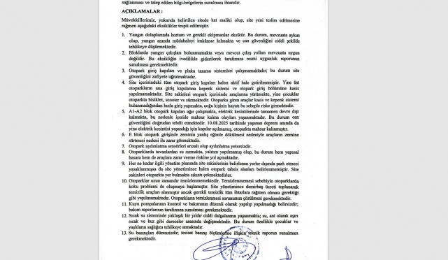 Yangın güvenliğinden otopark sorunlarına, mali şeffaflıktan sosyal tesislere kadar bitmeyen eksiklikler, site sakinlerini isyan ettirdi. Talepleri karşılanmayan kat malikleri, noter aracılığıyla firmaya hayati risk taşıyan alanlar için 72 saat, diğer eksiklikler için 30 gün sürelik ihtar göndererek hukuk yoluna başvuracaklarını ilan etti.İddialara göre, çok ciddi eksiklerin bulunduğu hayati tehlike arz eden sorunların çözülmediği sitede huzursuzluk hakim. Yangın güvenliği eksiklerinden otopark sorunlarına, mali şeffaflık yetersizliğinden sosyal tesislerin kullanılamamasına kadar birçok konuda yaşanan aksaklıklar site sakinlerini çileden çıkardı.Kat malikleri, sorunların çözülmemesi üzerine noter kanalıyla site yönetimine ve müteahhit firmaya ihtarname gönderdi. İhtarname ile hayati tehlike içeren eksikliklerin 72 saat içinde giderilmesi, diğer teknik ve inşai sorunların ise en geç 30 gün içinde çözülmesi talep edildi.“EKSİKLİKLER HAYATİ TEHLİKE ARZ EDİYOR”40 maddeden oluşan eksikliler ihtarname belirtildi. Sorunlar arasında; yangın dolaplarında hortum eksikliği, yangın çıkışlarının mevzuata aykırı olması, otopark güvenlik sistemlerinin çalışmaması, sıcak su ve su basınçlarında tehlikeli dalgalanmalar, çatılarda izolasyon sorunları, asansörlerde acil durum sistemlerinin çalışmaması ve sosyal tesislerin fiilen kullanılamaz halde olması gibi ciddi başlıklar yer alıyor.MALİ ŞEFFAFLIK TALEPLERİSite sakinleri ayrıca son 10 aya ait gelir-gider tablolarının paylaşılmamasından, toplanan aidat ve demirbaş bedellerinin nerelere harcandığının açıklanmamasından şikâyetçi.Tüm bu sorunların çözümsüz bırakılması halinde maddi-manevi tazminat talepli dava açacaklarını, sorumlular hakkında suç duyurusunda bulunacaklarını ve ilgili idari mercilere şikâyette bulunacaklarını belirten site sakinleri, “Artık tek çaremiz hukuk” dedi.