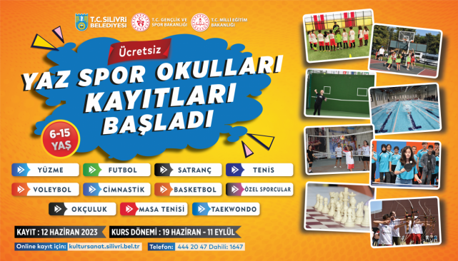 Silivri Belediyesi tarafından ilçede yaşayan öğrencilerin yaz tatilinde sporla iç içe olması amacıyla düzenlenen ücretsiz Yaz Spor Okullarında kayıt dönemi başladı. 12 Haziran 2023’te başlayan kayıt dönemi 18 Haziran 2023 tarihine kadar devam edecek. 2023 Yaz Spor Okullarında eğitimlerin başlayacağı tarih ise 19 Haziran 2023 olarak belirlendi. Gençlik ve Spor Bakanlığı, Milli Eğitim Bakanlığı ve Silivri Belediyesi iş birliğiyle gerçekleştirilen 2023 Yaz Spor Okullarına, 6-15 yaş aralığındaki tüm çocuklar katılım sağlayabilecek. Etkinlik ile öğrencilere; yüzme, futbol, satranç, tenis, voleybol, cimnastik, basketbol, özel sporcular, okçuluk, masa tenisi ve taekwondo gibi toplam 11 branşta ücretsiz kurslar verilecek. Yaz Spor Okullarında eğitimler 11 Eylül 2023 tarihinde sona erecek. Proje hakkında açıklamalarda bulunan Silivri Belediye Başkanı Volkan Yılmaz, “Göreve geldiğimiz ilk günden beri Silivri’de yaşayan her çocuğumuzun kültürle, sanatla ve sporla bezenmesi için var gücümüzle çalışıyoruz. Bu amaçla gerçekleştirdiğimiz projelerden biri olan ücretsiz Yaz Spor Okullarında, 2023 dönemi kayıtları başladı. Yaz Spor Okullarında çocuklarımız, 11 ayrı branşta hem profesyonel bir eğitim alıyor hem de keyifli bir şekilde spor faaliyetlerini gerçekleştirebiliyor. Bugüne kadar olduğu gibi bundan sonra da gençlerimiz ve çocuklarımız için spora, kültüre, sanata ve eğitime yönelik yatırım ve desteklerimize devam edeceğiz. Yaz Spor Okullarımıza katılan tüm çocuklarımıza şimdiden başarılar ve bol eğlenceler diliyorum.” dedi. BAŞVURULAR ONLİNE OLARAK ALINIYORYaz Spor Okulları kayıtları sadece online olarak yapılabiliyor. Etkinliğe katılmak isteyenler https://kultursanat.silivri.bel.tr/ web adresi üzerinden kolaylıkla kayıt yaptırabilirler. Detaylı bilgi almak isteyenler ise 0212 444 20 47 (Dahili-1647) numaralı telefona ulaşım sağlayabilirler.